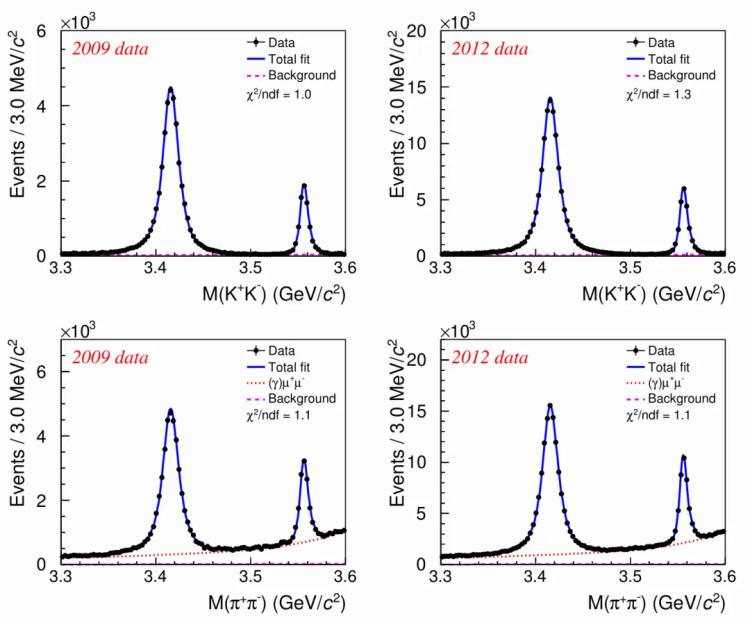 图3:2009年(第一列)和2012年(第二列)采集的ψ(2S)数据的K⁺K⁻(上行)和π⁺π⁻(下行)不变质量分布与拟合结果。
