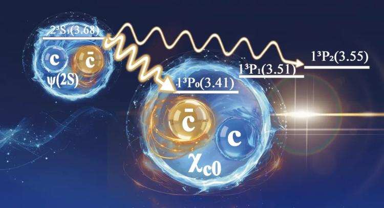 历经几代人的发展,目前BESIII是世界上正在运行的同类装置中,对撞亮度最高的实验。BESIII聚焦τ-粲能区这一独具特色的研究领域,产出了一系列国际前沿的成果。BESIII已经积累了世界上最大的ψ(2S)粲偶素粒子数据样本——多达2.7亿个,这为研究粲偶素谱学提供了一流的条件。利用海量的实验数据,BESIII研究了ψ(2S)通过发光的方式产生另一个粲偶素 的过程。 随后衰变为两个带电的轻介子——一对正反的 π 介子(π⁺π⁻),或者一对正反 K 介子(K⁺K⁻)。这些轻介子和辐射的光子就像 留下的“足迹”,BESIII探测器能把它们清晰地记录下来。科学家正是通过追踪这些足迹,一步步还原 的身世与秘密。图1示意了ψ(2S)辐射光子的跃迁过程。