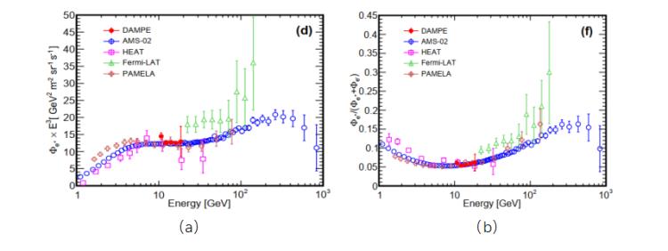 图6. 正电子结果。正电子通量(a)和正电子比例(b)