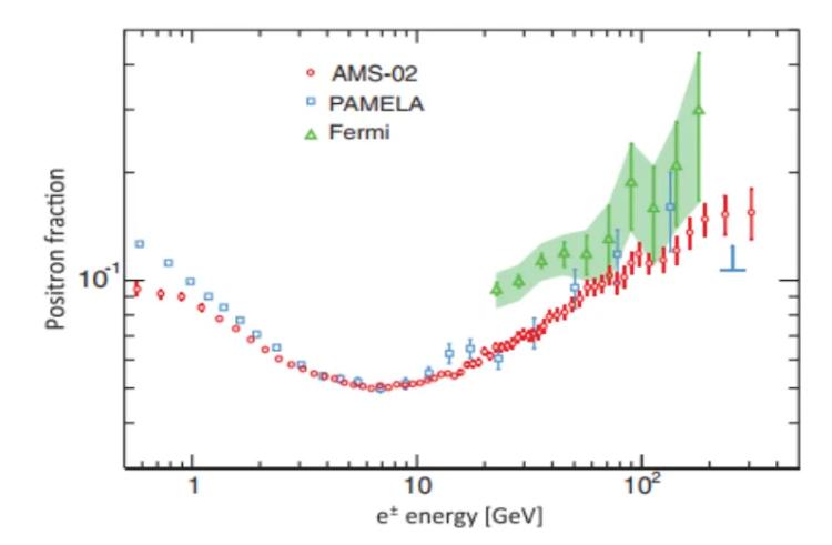 除了采用磁谱仪进行正电子的测量外,FERMI-LAT 合作组曾提出借助地磁场开展相关研究。FERMI-LAT 是美国宇航局 2008 年发射的运行在约 500 km 近地轨道上的大面积伽马射线望远镜,也称为FERMI卫星。FERMI-LAT 探测装置未携带磁铁,主要由径迹探测器、量能器和反符合探测器组成。借助地磁场效应,FERMI-LAT首次在轨实现了对正电子的观测。图 2 所示为不同实验测量的正电子比例结果,图中绿色三角形为 FERMI 卫星的结果,展示了 20 GeV – 200 GeV 能区正电子比例,该结果清晰地显示出该能区正电子比例随着能量的上升而增加,但相较于磁谱仪实验(红点为 AMS02、蓝点为PAMELA 实验)整体偏高了约 20%。
