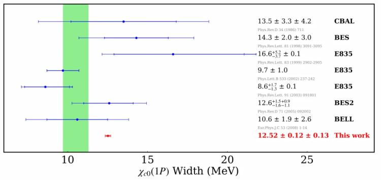 图3展示了此次测量的结果。正是得益于这些环环相扣、精密设计的实验步骤,最终BESIII实现了共振参数的精确测量。相比过去的单项实验,BESIII的质量精度提高了4倍,宽度精度更是提升了一个数量级,如图4所示。如今, 的共振参数精度已经达到和 、同等的先进水平。