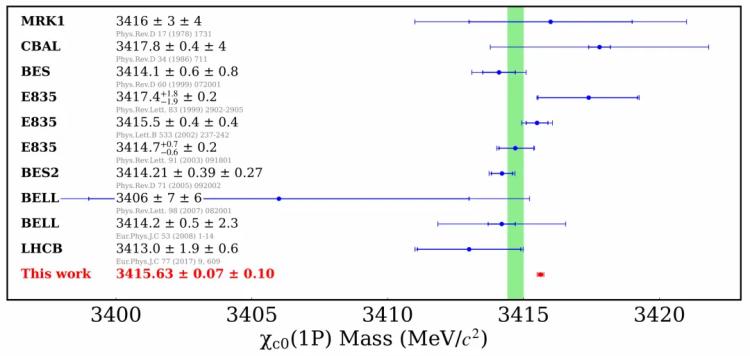 BESIII对 共振参数的精确测量,为P波粲偶素精确谱学拼上了最后一块关键的拼图,对科学家们准确研究粲偶素系统中强相互作用的规律、精确检验粲偶素辐射跃迁理论等具有深远的意义。更有趣的是,BESIII 同时精确测量了 衰变成两种介子对——π⁺π⁻ 和 K⁺K⁻的分支比,发现这两种衰变发生的概率几乎相等(测得的比值为 0.95)。这一结果比较好地印证了 SU(3)味对称性——一种描述不同轻夸克之间对称关系的理论。“胶球”是一种理论上预言的、由传播强相互作用的媒介粒子——胶子构成的神秘粒子,目前实验上尚没有确切发现。 作为一个典型的标量粒子,衰变行为与“标量胶球”有一定相似性,且衰变相空间大。 衰变过程中SU(3)味对称性的精确检验对研究胶球具有借鉴意义,为识别胶球提供了间接的实验参考。这进一步帮助我们探索物质最基本结构的奥秘。