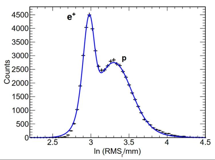 DAMPE 卫星中的 BGO 量能器像一个高像素照相机,有着优异的成像能力,可以对高能宇宙线在量能器中的作用行为进行成像。正电子属于轻子,与物质发生电磁作用;质子是强子,主要发生强作用。这使得正电子和质子在 BGO 量能器中的簇射行为不同,利用粒子在 BGO 量能器中的成像信息可以重建出描述正电子和质子事件簇射的参数(图5中的 ln(RMSr))。图5展示了鉴别出的正电子和质子事件,左边峰代表了正电子事件,右边是质子本底。