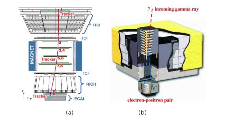 图1. 空间高能宇宙线实验探测谱仪示意图。AMS02(a)和FERMI-LAT(b)